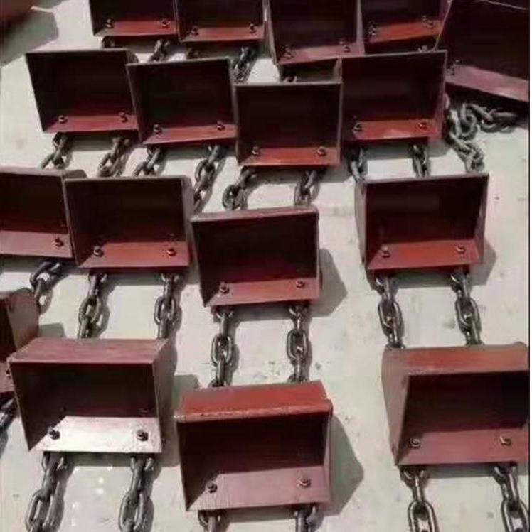 斗式提升機(jī)下部采用重力自動(dòng)張緊裝置,能保持恒定的張緊力,避免打滑或脫鏈,同時(shí)料斗遇到偶然因素引起的卡殼現(xiàn)象時(shí)有一定的容讓性,能夠有效地保護(hù)下部軸等部件。斗式提升機(jī)經(jīng)過(guò)長(zhǎng)時(shí)間運(yùn)行后,機(jī)器鏈條牽引機(jī)構(gòu)因?yàn)槭芰ξ恢玫淖兓?,磨損等各種因素情況容易發(fā)生斷裂、料斗脫落、鏈鉤斷裂等情況,這些意外事故嚴(yán)重影響斗提機(jī)的正常使用,解決斗式提升機(jī)鏈鉤斷裂問(wèn)題就要對(duì)鏈鉤進(jìn)行改進(jìn),更換新的鏈鉤,并將斗提機(jī)的墊板和鏈鉤焊為一體,消除鏈鉤單邊抗折應(yīng)力,使鏈鉤雙邊受力。這樣可以有效解決鏈鉤斷裂問(wèn)題,提高提升機(jī)提升效率,較少事故的發(fā)生。